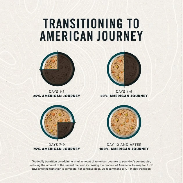 Gradually transition by adding a small amount of American Journey to your dog’s current diet, reducing the amount of the current diet and increasing the amount of American Journey for 7 – 10 days until the transition is complete. For sensitive dogs, we recommend a 10 – 14 day transition.