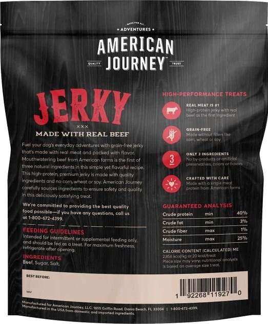 - American Journey Beef Jerky Grain-Free Dog Treats feature real beef from American farms as the first ingredient to deliver 38% protein to your pal.