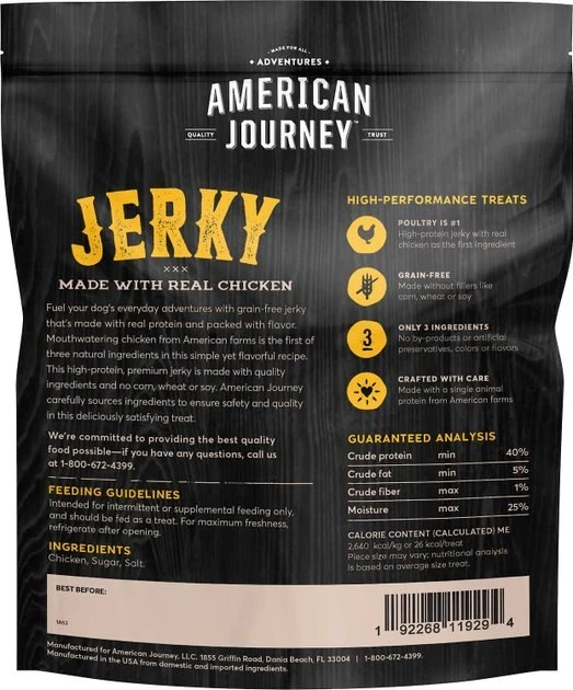 - American Journey Chicken Jerky Grain-Free Dog Treats feature real chicken from American farms as the first ingredient to deliver 40% protein to your pal.