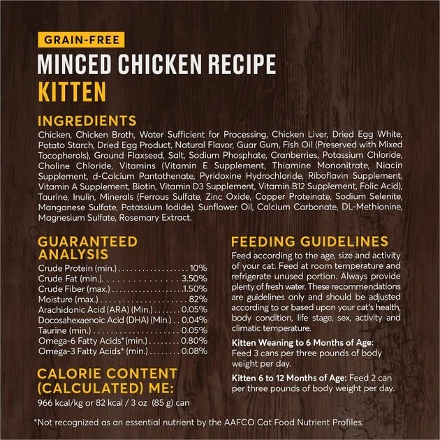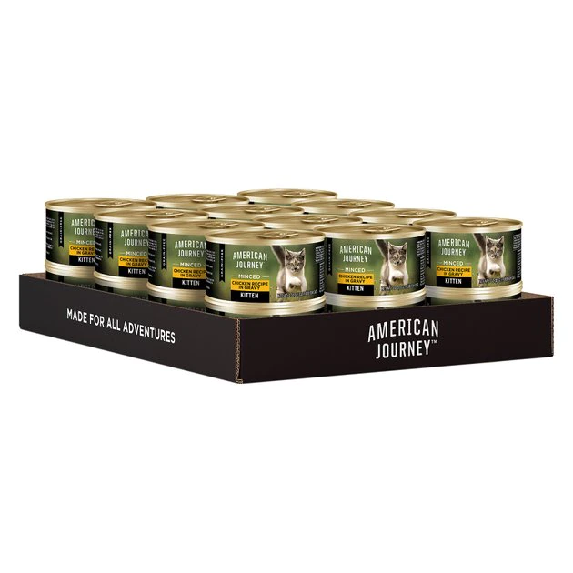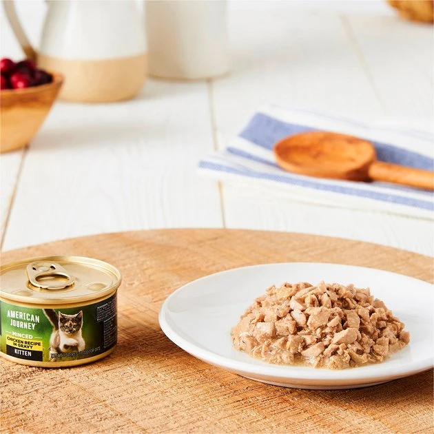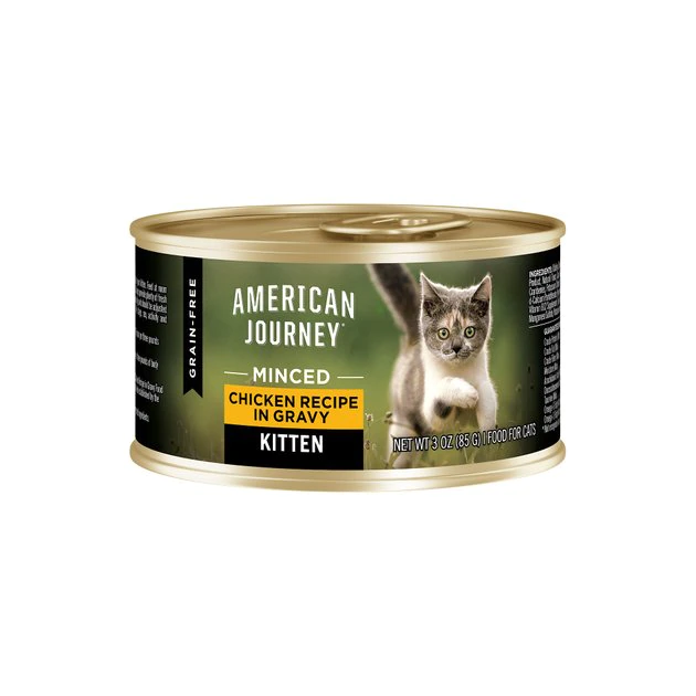 American Journey Kitten Minced Chicken Recipe is specially crafted to fuel your little kitten’s biggest adventures. It features real minced bites of chicken as the first ingredient to support lean, active muscles in growing kittens. It features important nutrients such as DHA and ARA to help support brain and eye development, plus fatty acids for skin and coat health. Your kitten will love the bite-sized minced chicken in a delicious savory gravy, plus you’ll feel good knowing their meal is made with only high-quality, wholesome ingredients like cranberries, flaxseed and fish oil. American Journey never uses any wheat, corn, soy, poultry by-product meals, or artificial preservatives, colors, or flavors. Give your little explorer the nutrition they deserve for all their epic adventures.