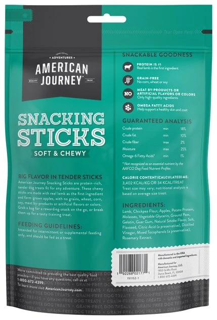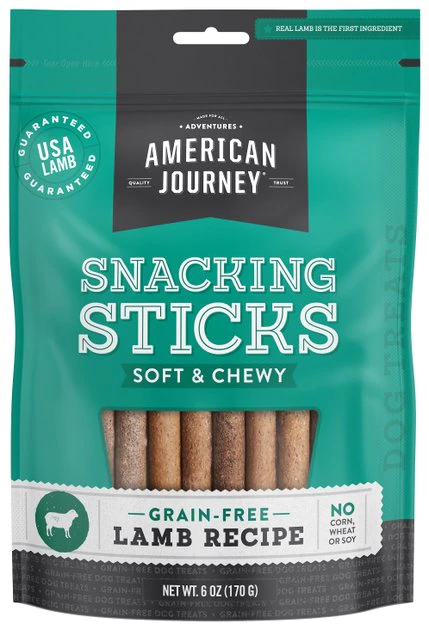 Reward your sidekick with a chewy, tasty treat that’s perfect for anytime snacking. American Journey Soft & Chewy Snacking Sticks are moist, soft treats that are crafted with real lamb as the first ingredient for the taste dogs crave. Give them whole for a satisfying snack or break them up into smaller bites for training. They’re crafted to provide the chewy texture dogs love, and loaded with nutrient-dense, easily digestible ingredients like peas, sweet potatoes, chickpeas and apples. Plus, they’re a source of omega fatty acids from flaxseed to support a healthy skin and coat.