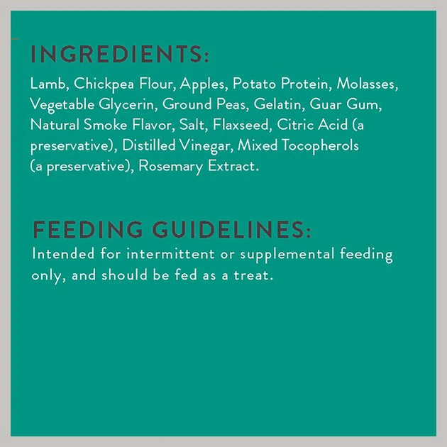 Lamb, Chickpea Flour, Apples, Potato Protein, Molasses, Vegetable Glycerin, Ground Peas, Gelatin, Guar Gum, Natural Smoke Flavor, Salt, Flaxseed, Citric Acid (a preservative), Distilled Vinegar, Mixed Tocopherols (a preservative), Rosemary Extract