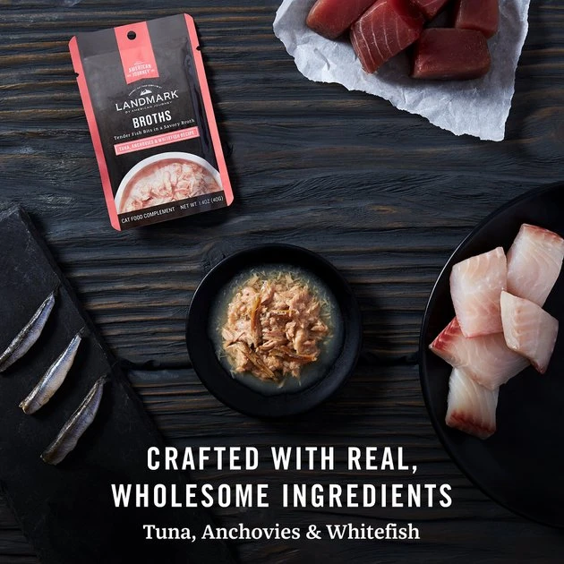 Indulge your cat with savory lickable broths from Landmark. Serve this recipe as a tasty, flavor-boosting topper for their everyday meals or on its own as a special, satisfying treat. No matter how you serve it, your cat is bound to love the multiple, premium proteins inside—including tuna, anchovies and whitefish—along with the irresistible, silky texture of the broth. Moist, lickable recipes like this one not only please a cat’s sophisticated palate, they also supplement feline hydration with a little extra moisture too. So, while they enjoy their wholesome reward, they’ll also get a boost of hydration to help keep them happy and healthy. Delicious, nutritious and moisture-rich—Landmark lickable treats are just the pampering experience your cat deserves.