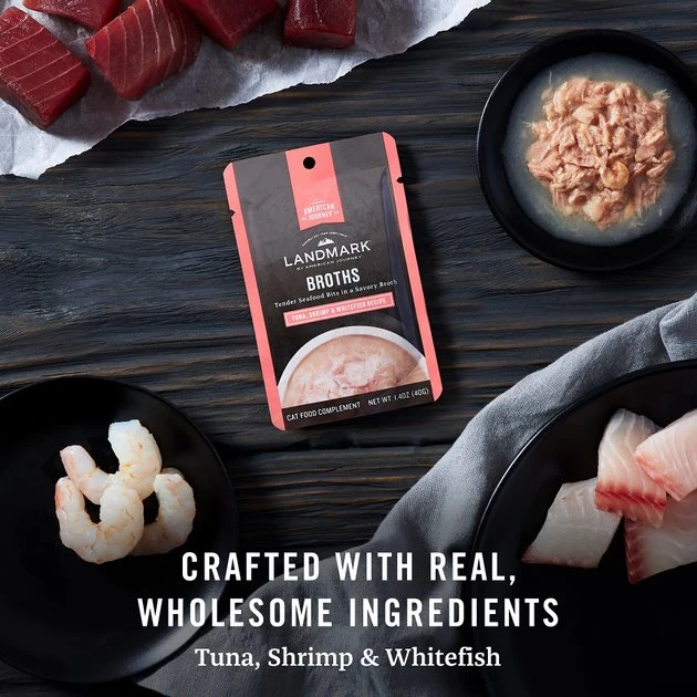 Indulge your cat with savory lickable broths from Landmark. Serve this recipe as a tasty, flavor-boosting topper for their everyday meals or on its own as a special, satisfying treat. No matter how you serve it, your cat is bound to love the multiple, premium proteins inside—including tuna, shrimp and whitefish—along with the irresistible, silky texture of the broth. Moist, lickable recipes like this one not only please a cat’s sophisticated palate, they also supplement feline hydration with a little extra moisture too. So, while they enjoy their wholesome reward, they’ll also get a boost of hydration to help keep them happy and healthy. Delicious, nutritious and moisture-rich—Landmark lickable treats are just the pampering experience your cat deserves.