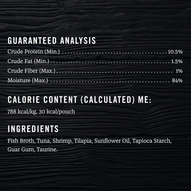 Fish Broth, Tuna, Shrimp, Tilapia, Sunflower Oil, Tapioca Starch, Guar Gum, Taurine.