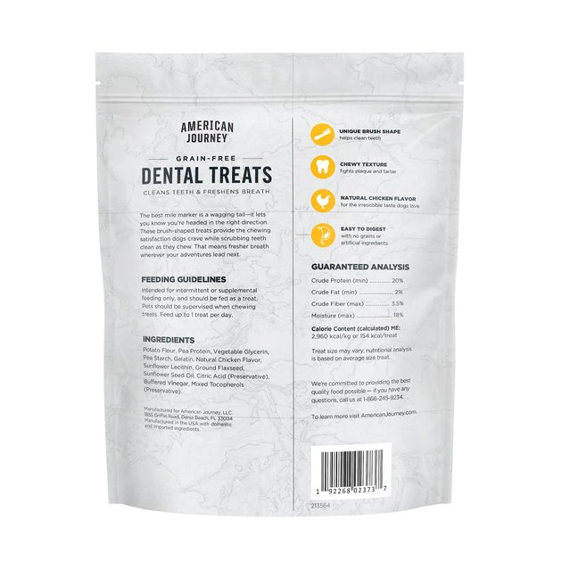 Freshen up your big doggy’s breath by rewarding your pup with original chicken-flavor American Journey Grain-Free Large Dental Dog Treats. These treats have a unique brush shape and a chewy texture that fights plaque and tartar buildup while they enjoy their snack. As your dog chews, these dental treats scrub all the hard-to-reach teeth, which means they’re awesome for between-brushing freshness. With a flavor dogs love and no grains, corn, wheat or soy, they’re easy to digest and perfect for everyday treating. They’re made to help keep your dog’s teeth in tip-top shape, and they’re just the right size for your friend at home. Plus, you can feel good about giving your dog these treats since they’re made with all-natural ingredients.