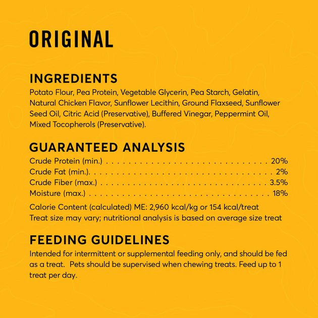 Potato Flour, Pea Protein, Vegetable Glycerin, Pea Starch, Gelatin, Natural Chicken Flavor, Sunflower Lecithin, Ground Flaxseed, Sunflower Seed Oil, Citric Acid (Preservative), Buffered Vinegar, Mixed Tocopherols (Preservative).
