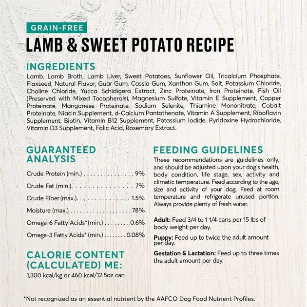 Lamb, Lamb Broth, Lamb Liver, Sweet Potatoes, Sunflower Oil, Tricalcium Phosphate, Flaxseed, Natural Flavor, Guar Gum, Cassia Gum, Xanthan Gum, Salt, Potassium Chloride, Choline Chloride, Yucca Schidigera Extract, Zinc Proteinate, Iron Proteinate, Fish Oil (Preserved with Mixed Tocopherols), Magnesium Sulfate, Vitamin E Supplement, Copper Proteinate, Manganese Proteinate, Sodium Selenite, Thiamine Mononitrate, Cobalt Proteinate, Niacin Supplement, d-Calcium Pantothenate, Vitamin A Supplement, Riboflavin Supplement, Biotin, Vitamin B12 Supplement, Potassium Iodide, Pyridoxine Hydrochloride, Vitamin D3 Supplement, Folic Acid, Rosemary Extract.