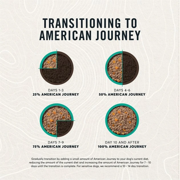 If you plan on transitioning to a new American Journey canned dog food flavor, we recommend mixing the food gradually for 7-10 days until the transition is complete. For sensitive dogs, we recommend a 10-14-day transition.