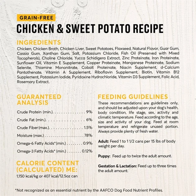 Chicken & Sweet Potato: 1,150 kcal/kg or 407 kcal/12.5oz can