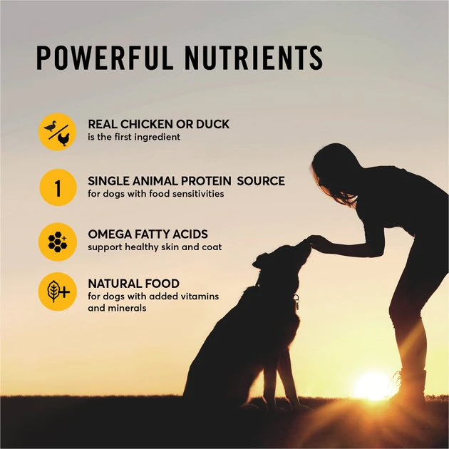 - There’s only one source of poultry protein from premium duck or chicken to help avoid food sensitivities to other proteins.