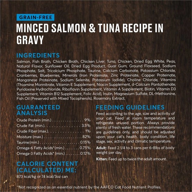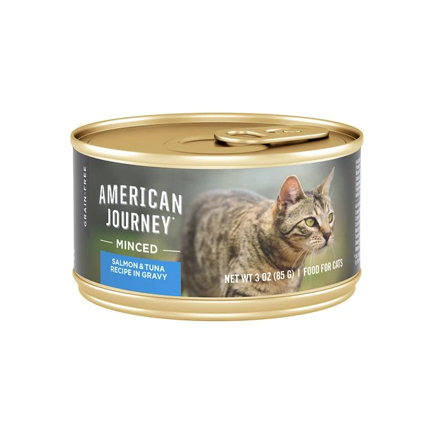 American Journey Minced Salmon & Tuna Recipe in Gravy Grain-Free Canned Cat Food starts with the real salmon that cats instinctively crave, covered in a delicious, savory gravy. This grain-free formula combines premium salmon and tuna for the seafood flavor your kitty loves and the nourishing nutrients she needs to thrive. These high-quality animal proteins help support lean muscles, and they deliver essential amino acids. Taurine is also added for healthy eyes and a healthy heart. You’ll find everything your kitty needs to keep her going on her daily adventures in this hearty meal. That includes wholesome ingredients like cranberries and blueberries, natural omega-3 and 6 fatty acids for skin and coat health, and added vitamins and minerals. American Journey leaves out corn, wheat, soy, poultry by-product meal and artificial colors, flavors and preservatives so you can be sure your cat is getting the nutrition she deserves.
