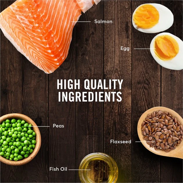 - Real salmon helps support lean muscle mass, and several sources of omega fatty acids are included for skin and coat health.