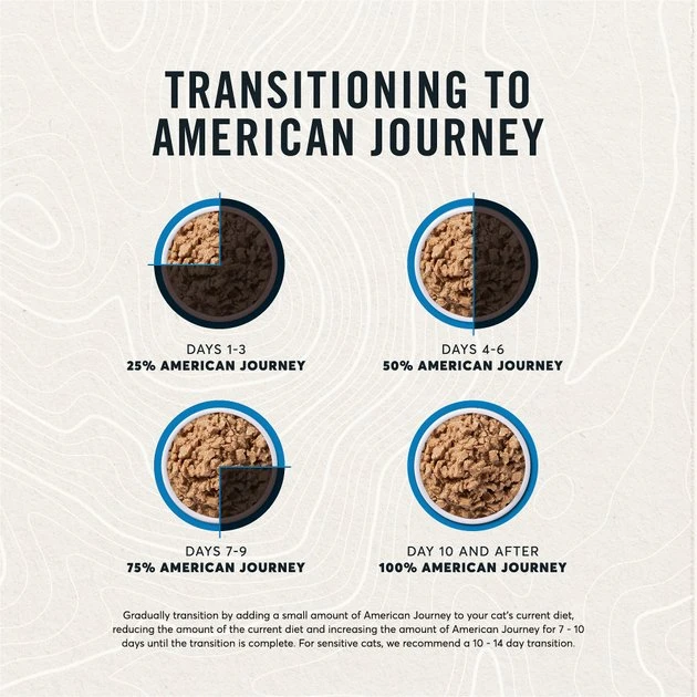 If you plan on transitioning to a new American Journey canned cat food flavor, we recommend mixing the food gradually for 7-10 days until the transition is complete. For sensitive cats, we recommend a 10-14-day transition.