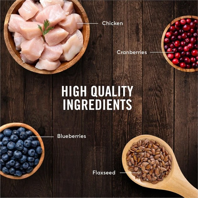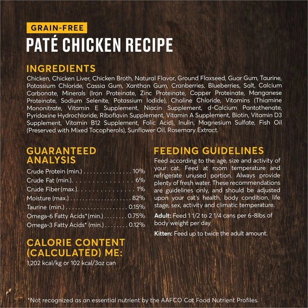 Chicken, Chicken Liver, Chicken Broth, Natural Flavor, Ground Flaxseed, Guar Gum, Taurine, Potassium Chloride, Cassia Gum, Xanthan Gum, Cranberries, Blueberries, Salt, Calcium Carbonate, Minerals (Iron Proteinate, Zinc Proteinate, Copper Proteinate, Manganese Proteinate, Sodium Selenite, Potassium Iodide), Choline Chloride, Vitamins (Thiamine Mononitrate, Vitamin E Supplement, Niacin Supplement, d-Calcium Pantothenate, Pyridoxine Hydrochloride, Riboflavin Supplement, Vitamin A Supplement, Biotin, Vitamin D3 Supplement, Vitamin B12 Supplement, Folic Acid), Inulin, Magnesium Sulfate, Fish Oil (Preserved with Mixed Tocopherols), Sunflower Oil, Rosemary Extract.
