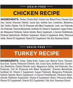 Chicken (Source of Glucosamine & Chondroitin Sulfate), Beef, Beef Liver, Chicken Broth, Beef Broth, Peas, Powdered Cellulose, Dried Plain Beet Pulp, Pea Protein, Natural Flavor, Ground Flaxseed, Sunflower Oil, Fish Oil (Preserved with Mixed Tocopherols), Guar Gum, Potassium Chloride, Minerals (Zinc Proteinate, Iron Proteinate, Copper Proteinate, Manganese Proteinate, Sodium Selenite, Potassium Iodide), Taurine, Salt, Choline Chloride, Vitamins (Thiamine Mononitrate, Vitamin E Supplement, Niacin Supplement, d-Calcium Pantothenate, Pyridoxine Hydrochloride, Riboflavin Supplement, Vitamin A Supplement, Biotin, Vitamin D3 Supplement, Vitamin B12 Supplement, Folic Acid), Yucca Schidigera Extract, Carrageenan, L-Ascorbyl-2-Polyphosphate (Source of Ascorbic Acid), L-Carnitine, Rosemary Extract.