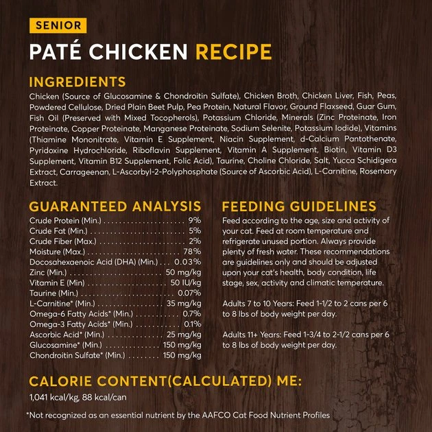 Serve up meals to keep your senior kitty thriving with recipes that are specially formulated to support a healthy life. Real chicken is the first ingredient and provides high-quality animal protein in a smooth paté texture that’s perfect for sensitive teeth. 100% complete and balanced, every recipe includes natural fiber and prebiotics to promote digestive health, DHA and taurine to support brain and heart health, and glucosamine and chondroitin to support healthy joints. Let your senior kitty savor all the special moments ahead with healthy recipes crafted with the nutrition they need and the protein they crave.