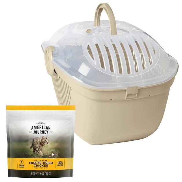 Reward your cat’s adventurous side and carnivore cravings with the Frisco Top Loading Cat Kennel and American Journey Freeze-Dried Treats bundle. Whether you’re headed to the vet or going on a cross-country road trip, you’ll feel good knowing your cat is safe and secure in their kennel. It features a convenient top-loading closure so you can easily help your cat get in and out, plus small openings on top so you can soothe your fur friend during travel. The multiple ventilation openings allow for constant and fresh airflow so your cat can always feel comfortable in their cozy spot. This kennel is designed with premium quality plastic for durable and long-lasting use, plus it’s easy to clean with warm and soapy water. It’s the perfect accessory for your precious cargo! With all the traveling around, Kitty will certainly get hungry. Crafted with just one ingredient—real, USA-sourced deboned chicken breast—and nothing else, these crunchy morsels pack plenty of flavor and nutrients into every bite with nothing extra. They’re freeze-dried, not dehydrated, which means they retain the natural taste and nutritional value of real chicken—including amino acids to support active, healthy muscles.