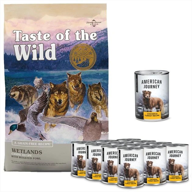 - Each purchase comes with Taste of the Wild Wetlands Grain-Free Dry Dog Food, 28-lb bag & American Journey Chicken & Turkey Recipe Grain-Free Canned Dog Food, 12.5-oz, case of 12.