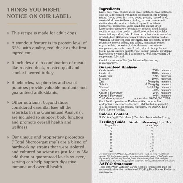 - Taste of the Wild Wetlands Grain-Free Dry Dog Food is made with real duck as the first ingredient followed by other real protein-rich ingredients including roasted quail and turkey for lean nutrition and to help support strong muscles.